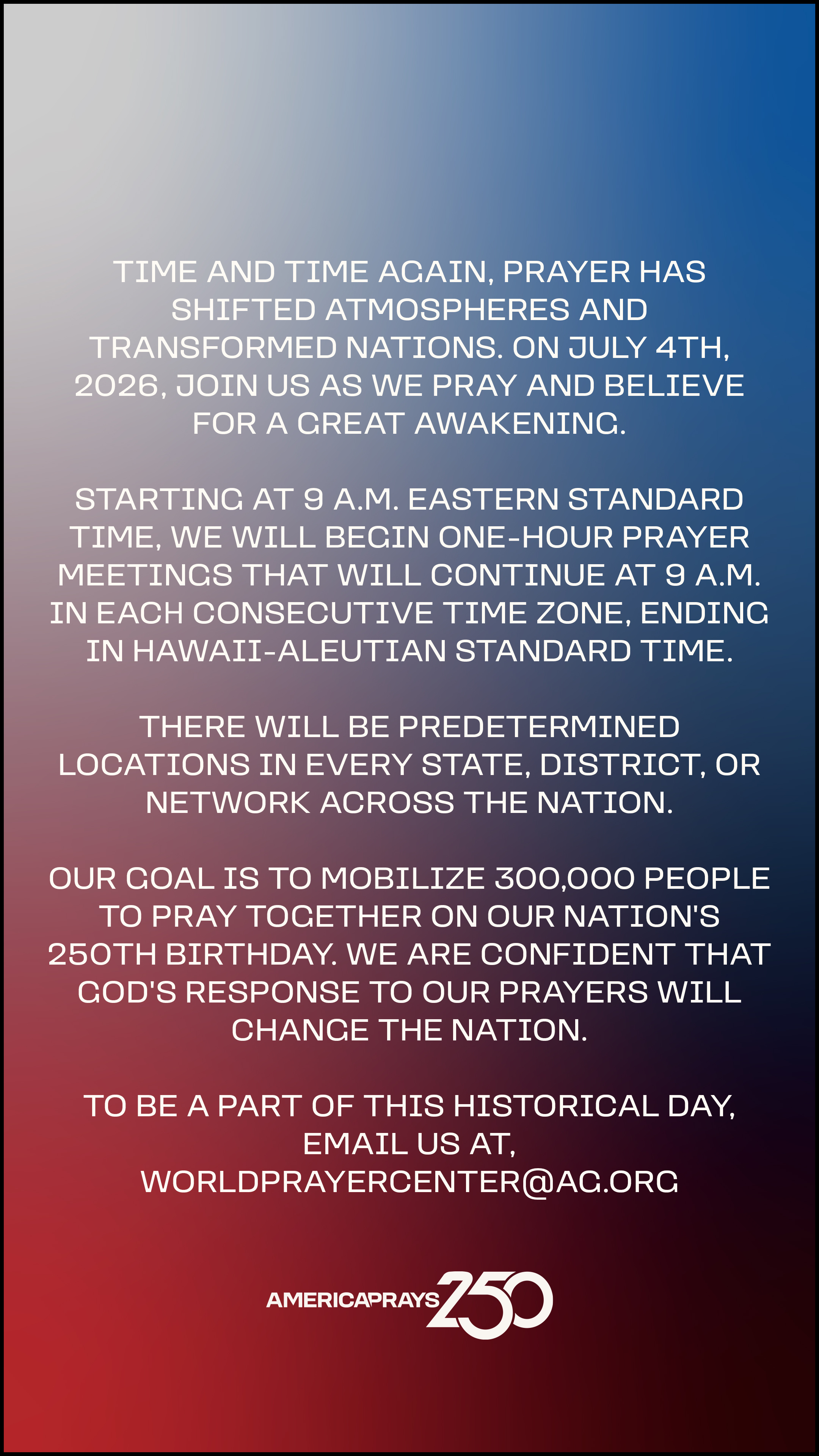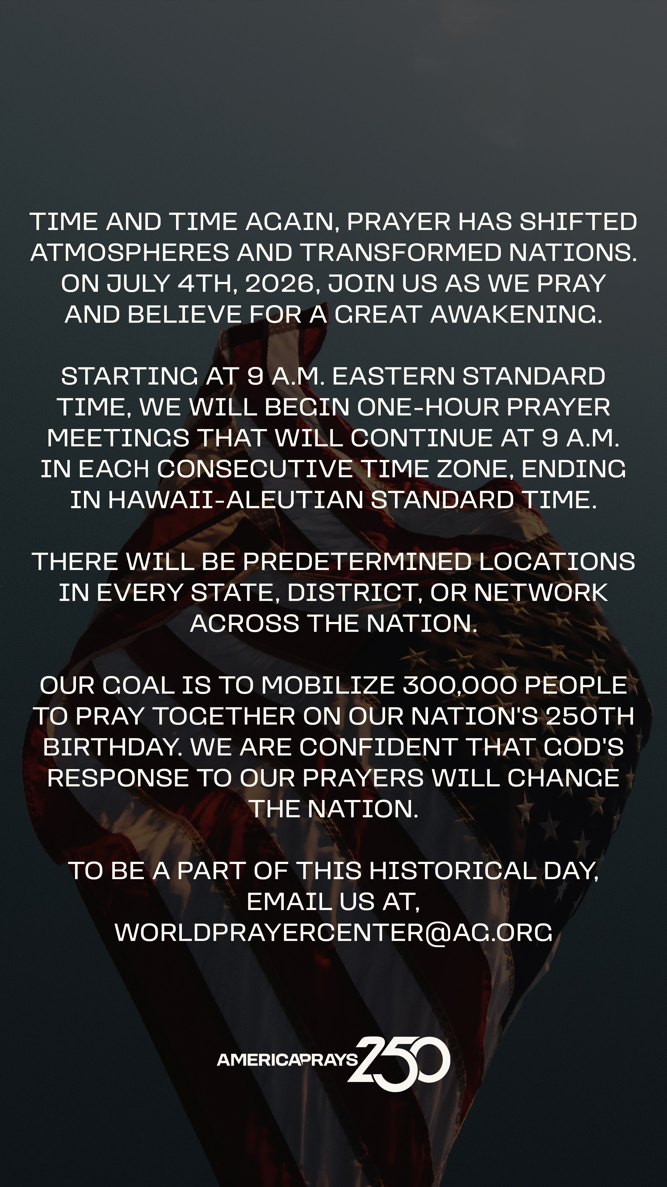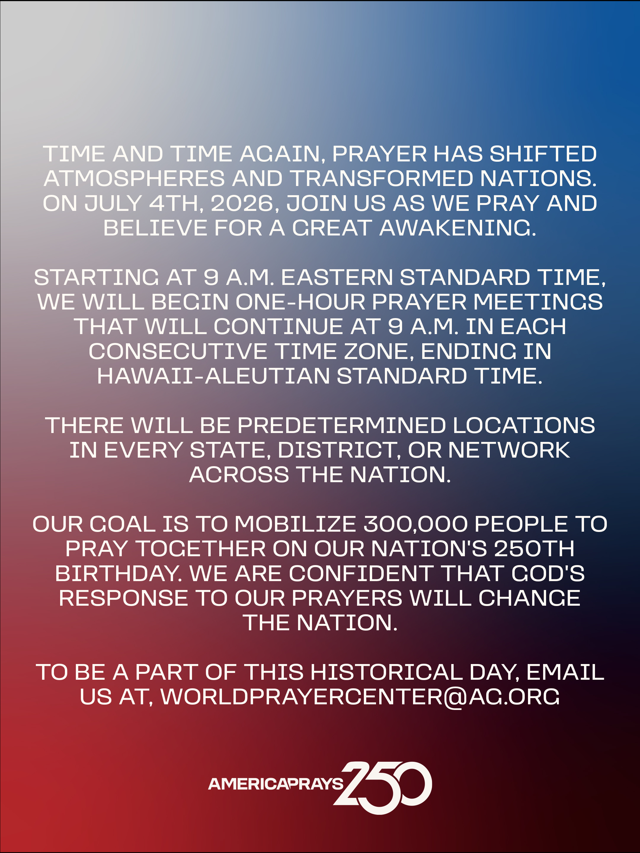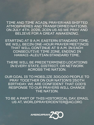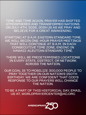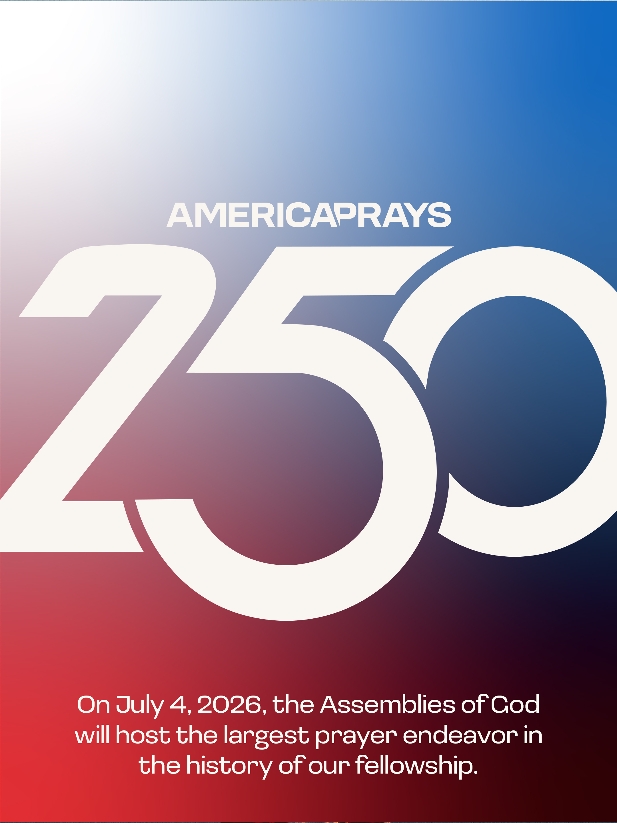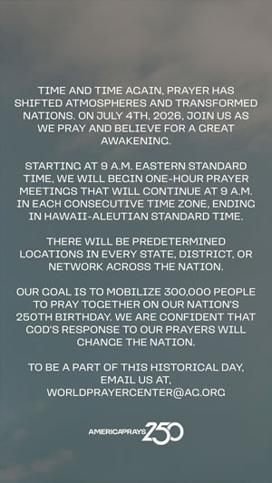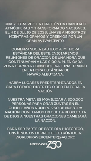 Resources Help promote America Prays 250 with these promotional resources! Graphics (English) Download Image 1 Download Image 2 Download Image 3 Download Image 4 Download Image 5 Download Image 6 Download Image 7 Download Image 8 Download Image 9 Social Media Graphics (English) Download Story Graphic 1 Download Story Graphic 2 Download Story Graphic 3 Download Story Graphic 4 Download Story Graphic 5 Download Story Graphic 6 Download Story Graphic 7 Download Story Graphic 8 Download Story Graphic 9 Videos Your browser does not support the HTML5 Video element. Download AG Leadership Intro Video Your browser does not support the HTML5 Video element. Download General Invitation Video QR Code - Registration Download QR Code Image Graphics (Spanish) Download Image 1 Download Image 2 Download Image 3 Social Media Graphics (Spanish) Download Story Graphic 1 Download Story Graphic 2 Download Story Graphic 3