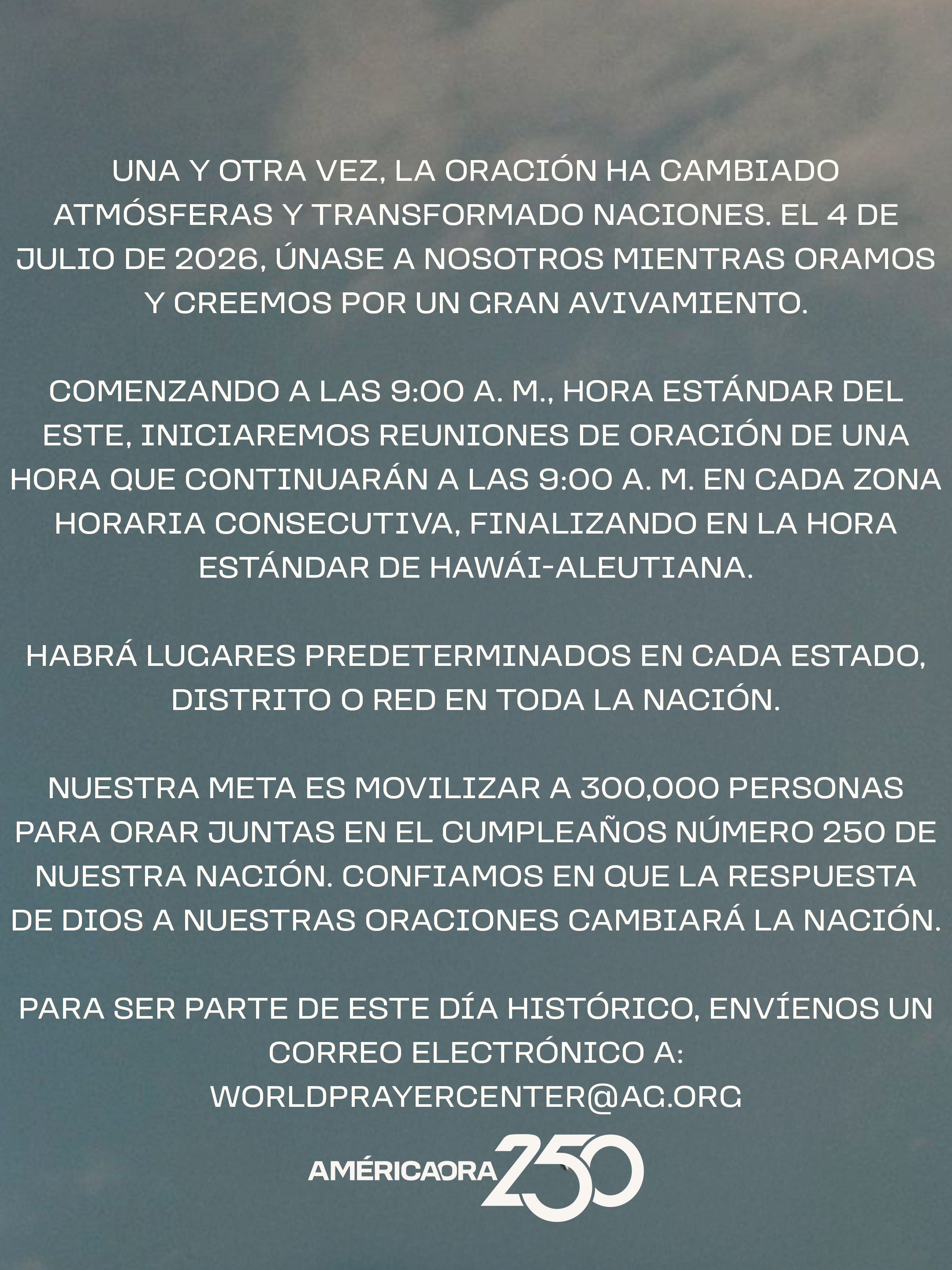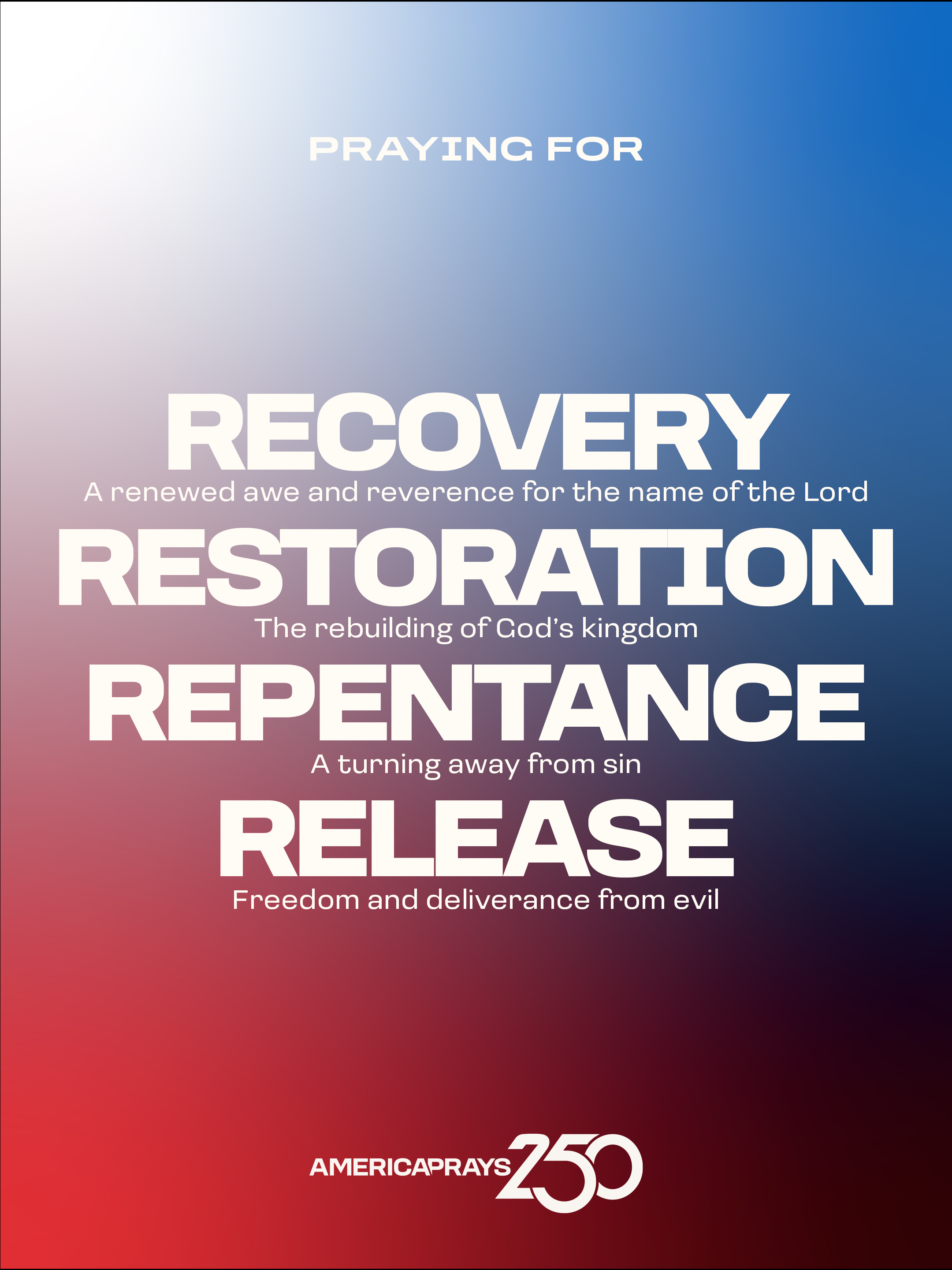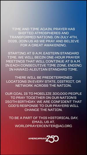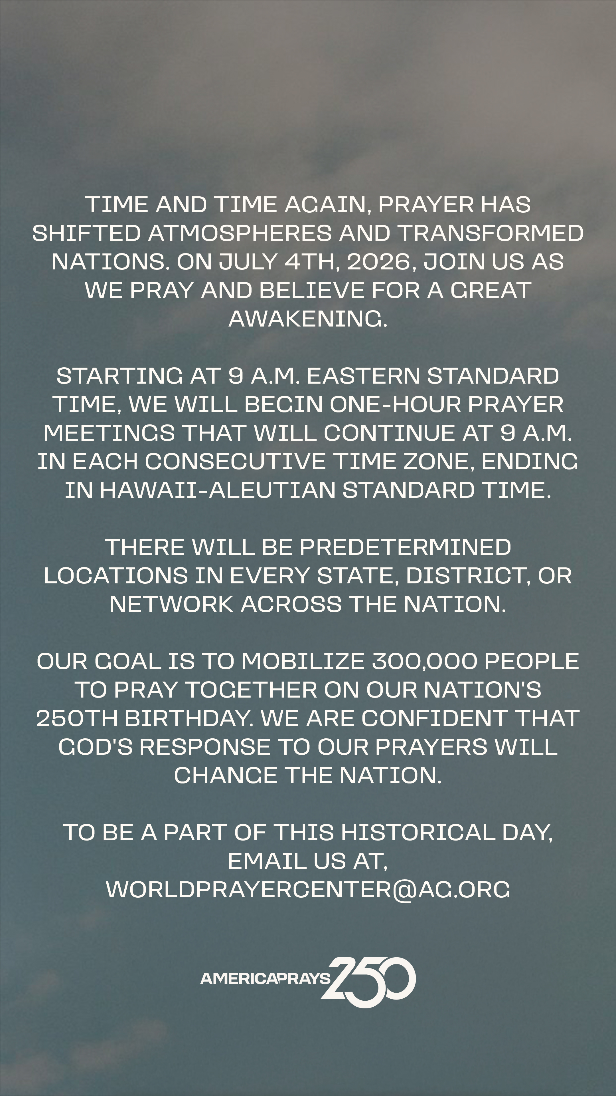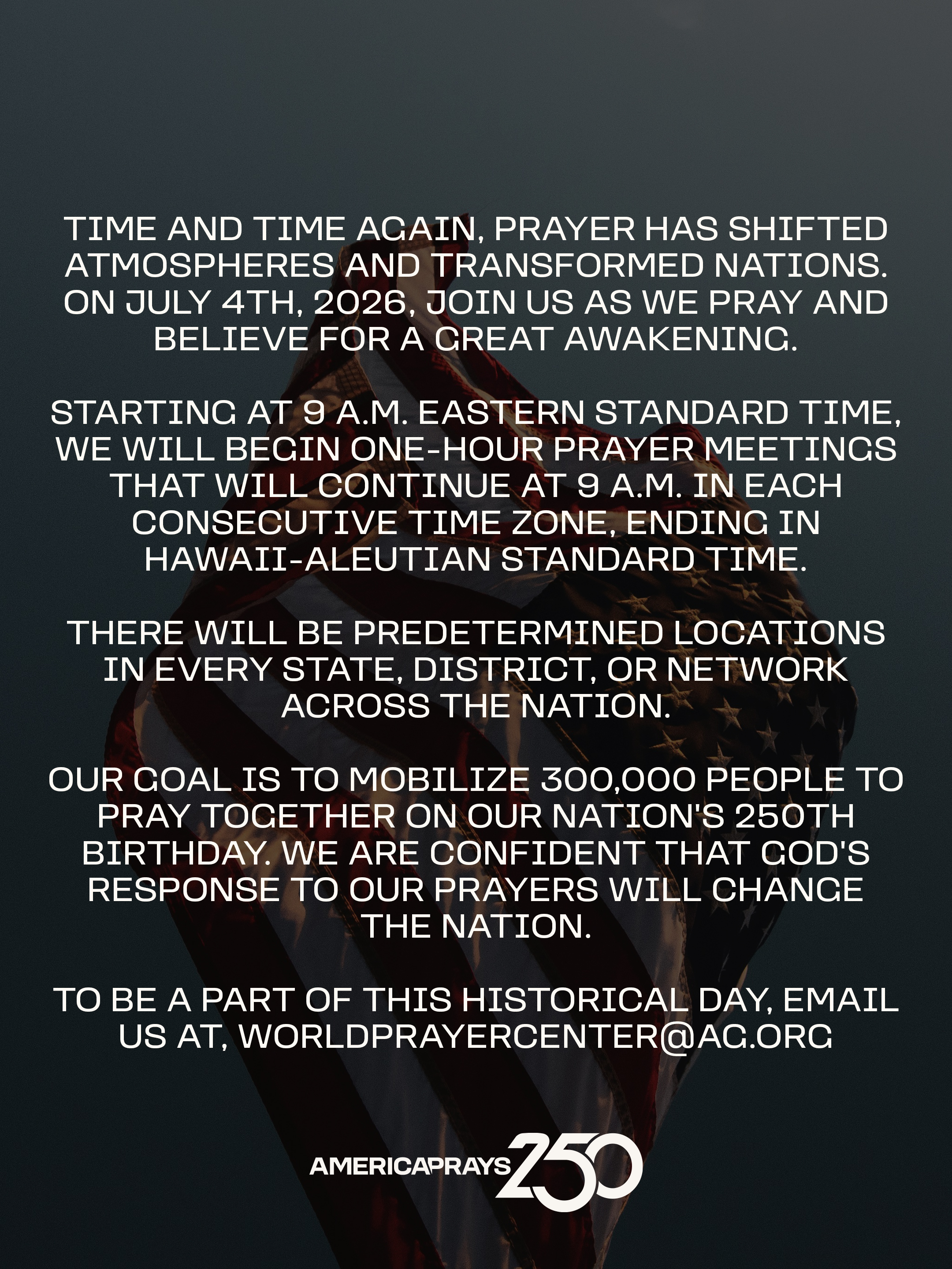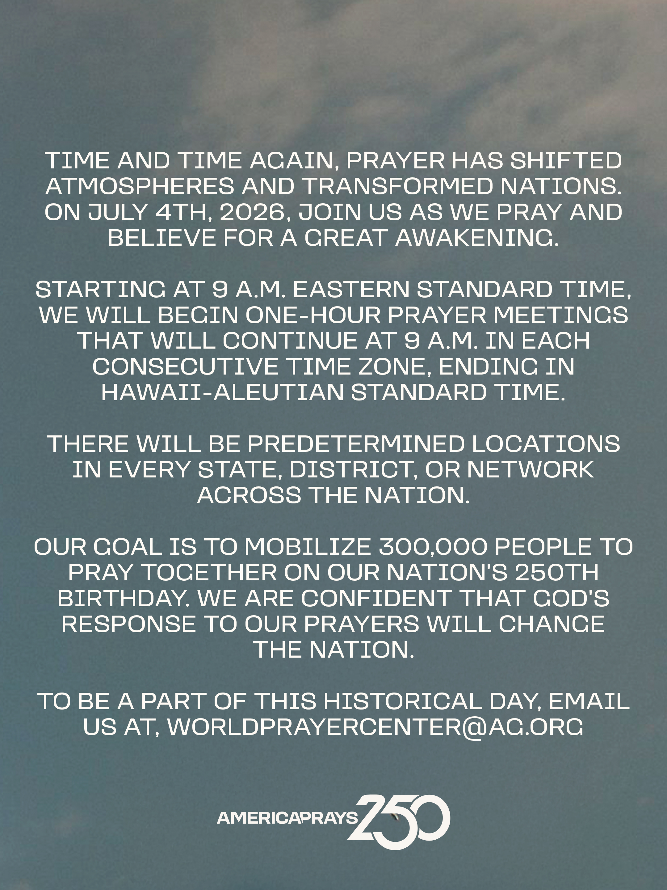 Resources Help promote America Prays 250 with these promotional resources! Graphics (English) Download Image 1 Download Image 2 Download Image 3 Download Image 4 Download Image 5 Download Image 6 Download Image 7 Download Image 8 Download Image 9 Social Media Graphics (English) Download Story Graphic 1 Download Story Graphic 2 Download Story Graphic 3 Download Story Graphic 4 Download Story Graphic 5 Download Story Graphic 6 Download Story Graphic 7 Download Story Graphic 8 Download Story Graphic 9 Videos Your browser does not support the HTML5 Video element. Download AG Leadership Intro Video Your browser does not support the HTML5 Video element. Download General Invitation Video QR Code - Registration Download QR Code Image Graphics (Spanish) Download Image 1 Download Image 2 Download Image 3 Social Media Graphics (Spanish) Download Story Graphic 1 Download Story Graphic 2 Download Story Graphic 3
